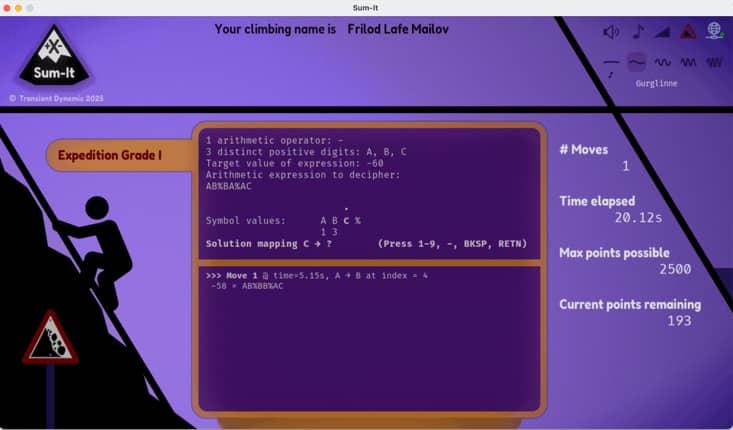 Happy New Year to one my earliest subscribers! I'm delighted to share that I've just launched a free-to-play browser codebreaker puzzle game called "Sum-It!". If you signed up to my list because of interest in the sci-fi mystery hacking simulator OPERANDi, that's still in progress, and this game also has a "hacking" element to it. (In fact, this puzzle was developed as a 'daily' mini-game within OPERANDi, but it seemed like a fun idea to develop it into a standalone game too.) In Sum-It, you are encouraged to write your own code to solve the procedurally-generated puzzles as fast as possible in as few moves as possible, interacting with the game via its internally-hosted API. There's an online leaderboard to aim for! https://transient-dynamic.itch.io/sum-it An example python API client and the OST is included in the downloadable version of the game (PC/Mac). Please let me know your feedback in the comments! -Rob |